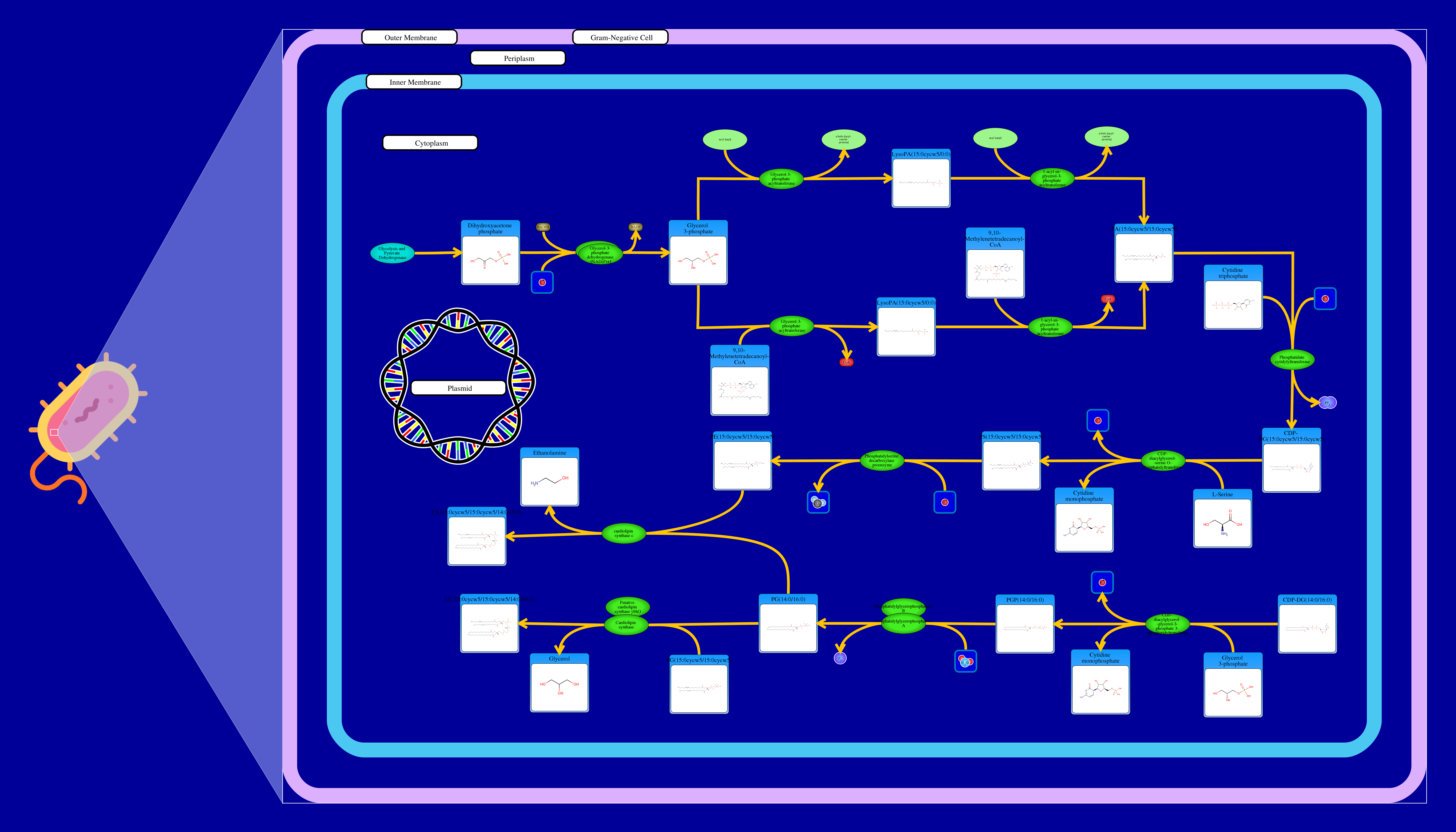 Phospholipids are membrane components in E. coli. The major phospholipids of E. coli are phosphatidylethanolamine, phosphatidylglycerol, and cardiolipin. All phospholipids contain sn-glycerol-3-phosphate esterified with fatty acids at the sn-1 and sn-2 positions. The reaction starts from a glycerone phosphate (dihydroxyacetone phosphate) produced in glycolysis. The glycerone phosphate is transformed into an sn-glycerol 3-phosphate (glycerol 3 phosphate) by NADPH-driven glycerol-3-phosphate dehydrogenase. sn-Glycerol 3-phosphate is transformed to a 1-acyl-sn-glycerol 3-phosphate (lysophosphatidic acid). This can be achieved by an sn-glycerol-3-phosphate acyltransferase that interacts either with a long-chain acyl-CoA or with an acyl-[acp]. The 1-acyl-sn-glycerol 3-phosphate is transformed into a 1,2-diacyl-sn-glycerol 3-phosphate (phosphatidic acid) through a 1-acylglycerol-3-phosphate O-acyltransferase. This compound is then converted into a CPD-diacylglycerol through a CTP phosphatidate cytididyltransferase. CPD-diacylglycerol can be transformed either into an L-1-phosphatidylserine or an L-1-phosphatidylglycerol-phosphate through a phosphatidylserine synthase or a phosphatidylglycerophosphate synthase, respectively. The L-1-phosphatidylserine transforms into L-1-phosphatidylethanolamine through a phosphatidylserine decarboxylase. On the other hand, L-1-phosphatidylglycerol-phosphate gets transformed into an L-1-phosphatidyl-glycerol through a phosphatidylglycerophosphatase. These 2 products combine to produce a cardiolipin and an ethanolamine. The L-1 phosphatidyl-glycerol can also interact with cardiolipin synthase resulting in a glycerol and a cardiolipin.