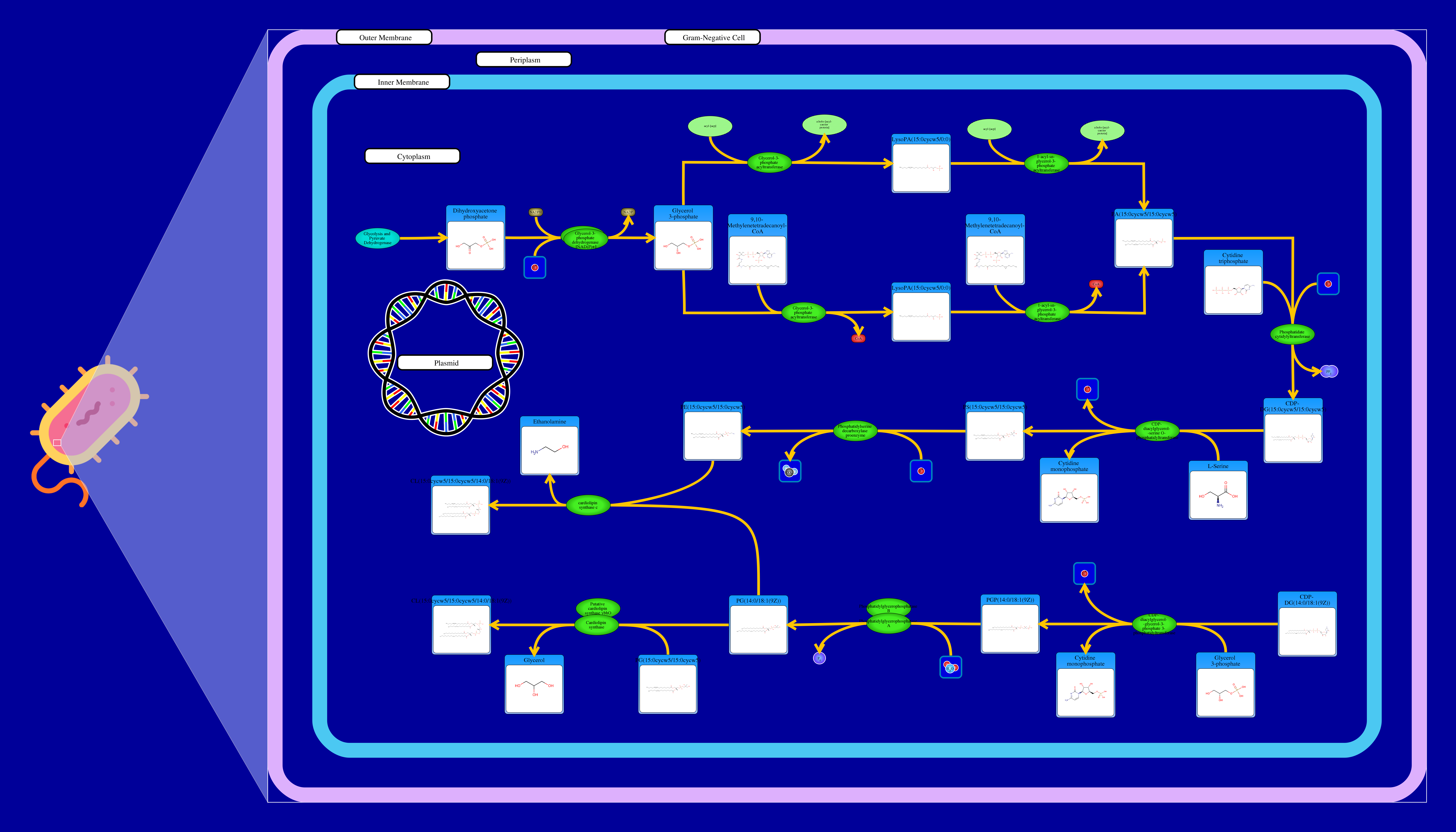 Phospholipids are membrane components in E. coli. The major phospholipids of E. coli are phosphatidylethanolamine, phosphatidylglycerol, and cardiolipin. All phospholipids contain sn-glycerol-3-phosphate esterified with fatty acids at the sn-1 and sn-2 positions. The reaction starts from a glycerone phosphate (dihydroxyacetone phosphate) produced in glycolysis. The glycerone phosphate is transformed into an sn-glycerol 3-phosphate (glycerol 3 phosphate) by NADPH-driven glycerol-3-phosphate dehydrogenase. sn-Glycerol 3-phosphate is transformed to a 1-acyl-sn-glycerol 3-phosphate (lysophosphatidic acid). This can be achieved by an sn-glycerol-3-phosphate acyltransferase that interacts either with a long-chain acyl-CoA or with an acyl-[acp]. The 1-acyl-sn-glycerol 3-phosphate is transformed into a 1,2-diacyl-sn-glycerol 3-phosphate (phosphatidic acid) through a 1-acylglycerol-3-phosphate O-acyltransferase. This compound is then converted into a CPD-diacylglycerol through a CTP phosphatidate cytididyltransferase. CPD-diacylglycerol can be transformed either into an L-1-phosphatidylserine or an L-1-phosphatidylglycerol-phosphate through a phosphatidylserine synthase or a phosphatidylglycerophosphate synthase, respectively. The L-1-phosphatidylserine transforms into L-1-phosphatidylethanolamine through a phosphatidylserine decarboxylase. On the other hand, L-1-phosphatidylglycerol-phosphate gets transformed into an L-1-phosphatidyl-glycerol through a phosphatidylglycerophosphatase. These 2 products combine to produce a cardiolipin and an ethanolamine. The L-1 phosphatidyl-glycerol can also interact with cardiolipin synthase resulting in a glycerol and a cardiolipin.