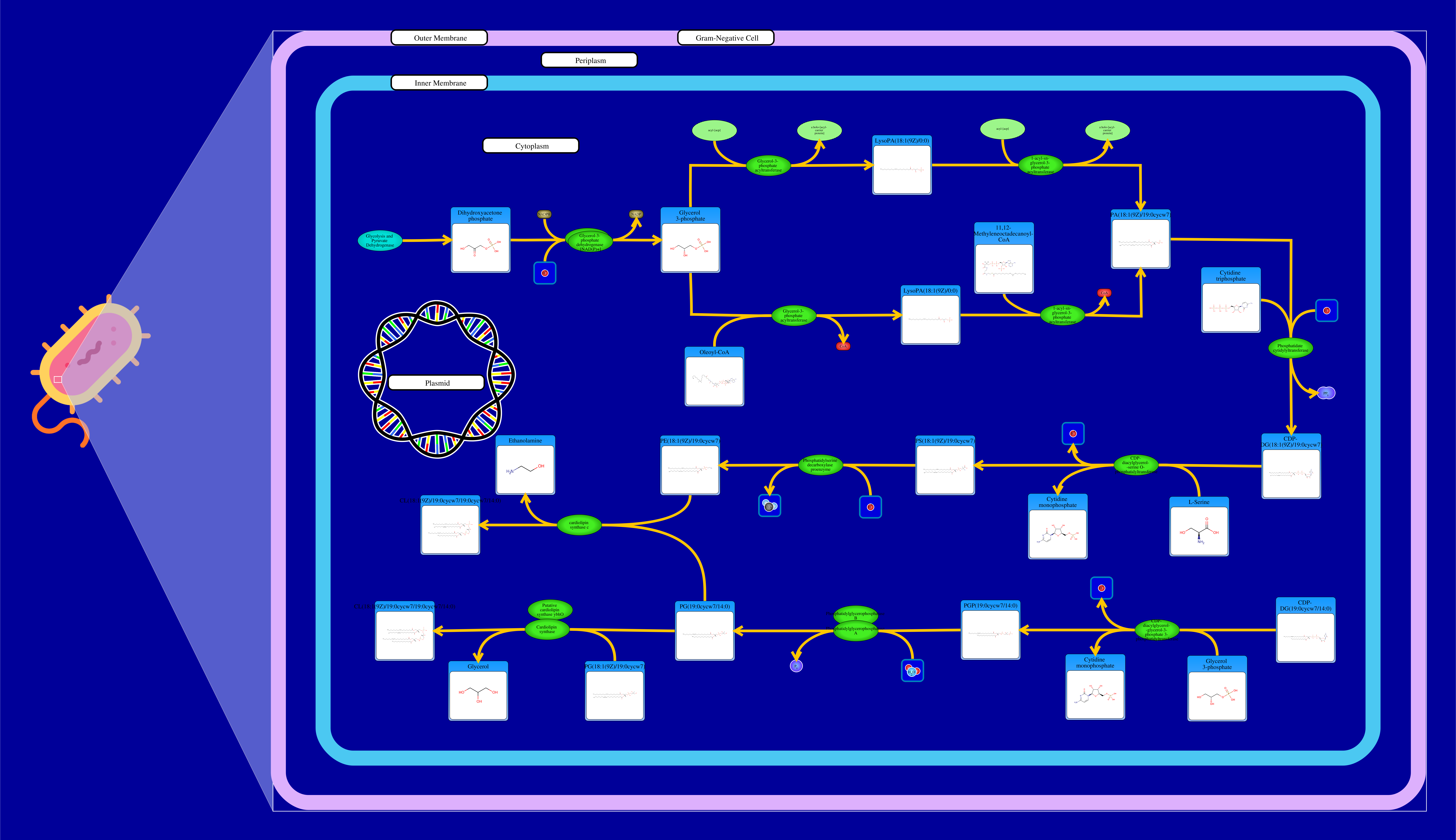 Phospholipids are membrane components in E. coli. The major phospholipids of E. coli are phosphatidylethanolamine, phosphatidylglycerol, and cardiolipin. All phospholipids contain sn-glycerol-3-phosphate esterified with fatty acids at the sn-1 and sn-2 positions. The reaction starts from a glycerone phosphate (dihydroxyacetone phosphate) produced in glycolysis. The glycerone phosphate is transformed into an sn-glycerol 3-phosphate (glycerol 3 phosphate) by NADPH-driven glycerol-3-phosphate dehydrogenase. sn-Glycerol 3-phosphate is transformed to a 1-acyl-sn-glycerol 3-phosphate (lysophosphatidic acid). This can be achieved by an sn-glycerol-3-phosphate acyltransferase that interacts either with a long-chain acyl-CoA or with an acyl-[acp]. The 1-acyl-sn-glycerol 3-phosphate is transformed into a 1,2-diacyl-sn-glycerol 3-phosphate (phosphatidic acid) through a 1-acylglycerol-3-phosphate O-acyltransferase. This compound is then converted into a CPD-diacylglycerol through a CTP phosphatidate cytididyltransferase. CPD-diacylglycerol can be transformed either into an L-1-phosphatidylserine or an L-1-phosphatidylglycerol-phosphate through a phosphatidylserine synthase or a phosphatidylglycerophosphate synthase, respectively. The L-1-phosphatidylserine transforms into L-1-phosphatidylethanolamine through a phosphatidylserine decarboxylase. On the other hand, L-1-phosphatidylglycerol-phosphate gets transformed into an L-1-phosphatidyl-glycerol through a phosphatidylglycerophosphatase. These 2 products combine to produce a cardiolipin and an ethanolamine. The L-1 phosphatidyl-glycerol can also interact with cardiolipin synthase resulting in a glycerol and a cardiolipin.